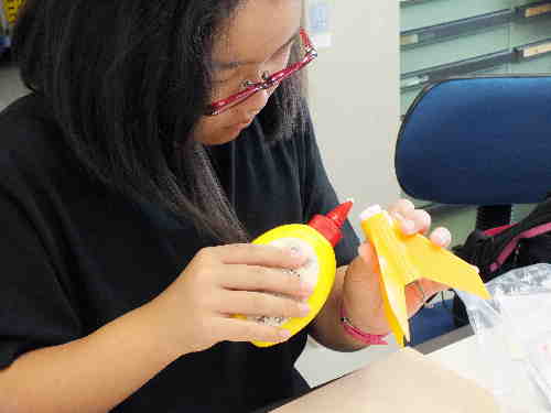 | 最初に製作したのは、長さ約30cm、3翼のモデルロケット「アルファーV」。キットになっているので、説明書通りに、組み立てればできあがります。 ロケット回収用のパラシュートは小さくたたんで、モデルロケット上部に組み込みます。うまく上空で開いてくれるでしょうか。 |